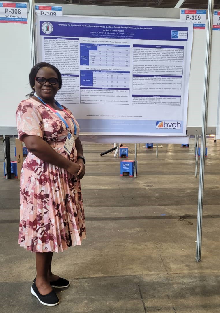 Dr. Alabi presents study results at EACR. Dr. Adewumi Alabi (Consultant Clinical and Radiation Oncologist, NSIA-LUTH Cancer Center [NLCC]) recently traveled to Rotterdam, Netherlands to present her research during the European Association for Cancer Research (EACR) 2024 congress. Dr. Alabi’s poster, “Determining the Right Formula for Neoadjuvant Chemotherapy to Achieve Complete Pathologic Response in aContinue reading “NLCC Researcher Presents Results of Research at Annual EACR Congress”